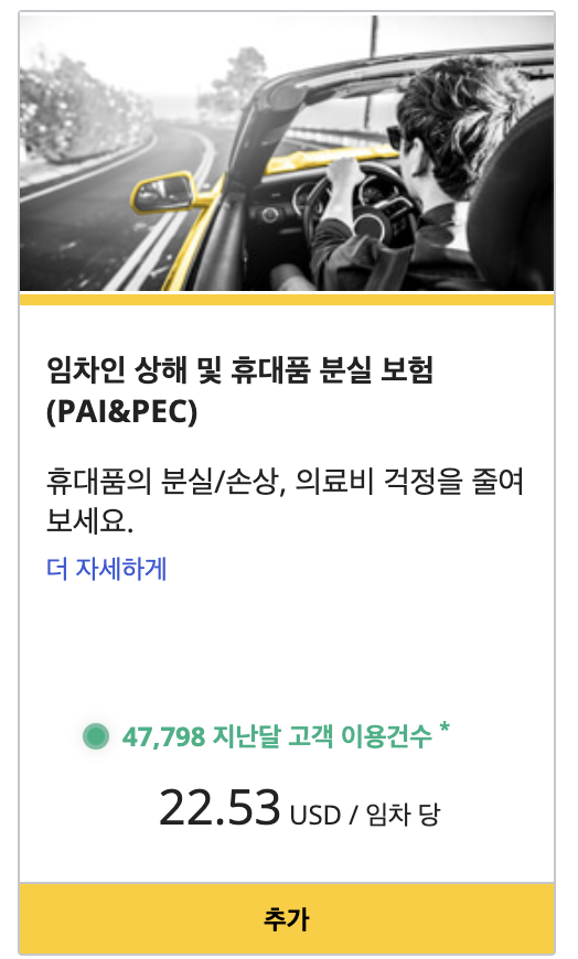 차종을 선택하고 나면 보험 및 오디오, 아동용 카 시트 등 다양한 추가 옵션들이 나오는데,