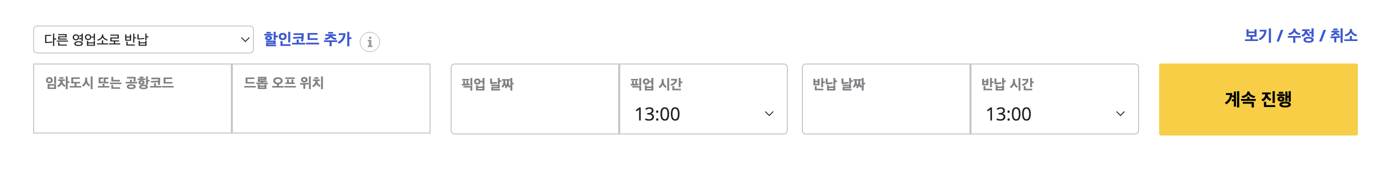 위의 Hertz 렌터카 홈페이지에서 차를 대여할 위치, 대여할 기간을 입력하면